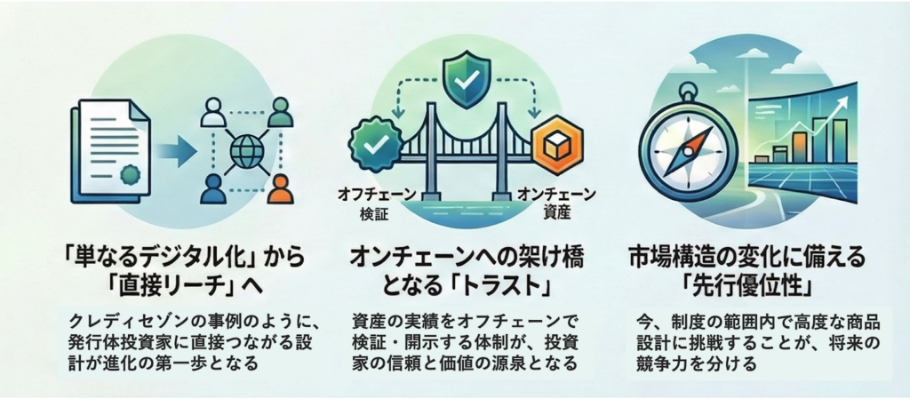 将来、デジタル証券やトークン化資産がより広く金融インフラに組み込まれていくとすれば、重要になるのは、制度を知っていることだけではありません。どこまで挑戦し、どこまで将来に向けた設計思想を今の案件に埋め込めるか。 その差が、次の市場での競争力を分けるはずです。
