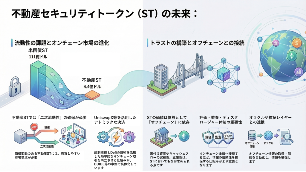 不動産STが将来的にオンチェーン上の投資家にとって本当に使いやすい商品として認められるかどうかは、単に発行できるかどうかではなく、規制を遵守しながら、価格形成と流動性の課題にどこまで向き合えるかにかかっています。UniswapXのような仕組みとの連携は、少なくとも、トークン化資産が「保有するだけの資産」から「市場の中で使える資産」へ進化していく方向性を示すものとして、不動産STにとっても重要な先行事例だと考えられます。